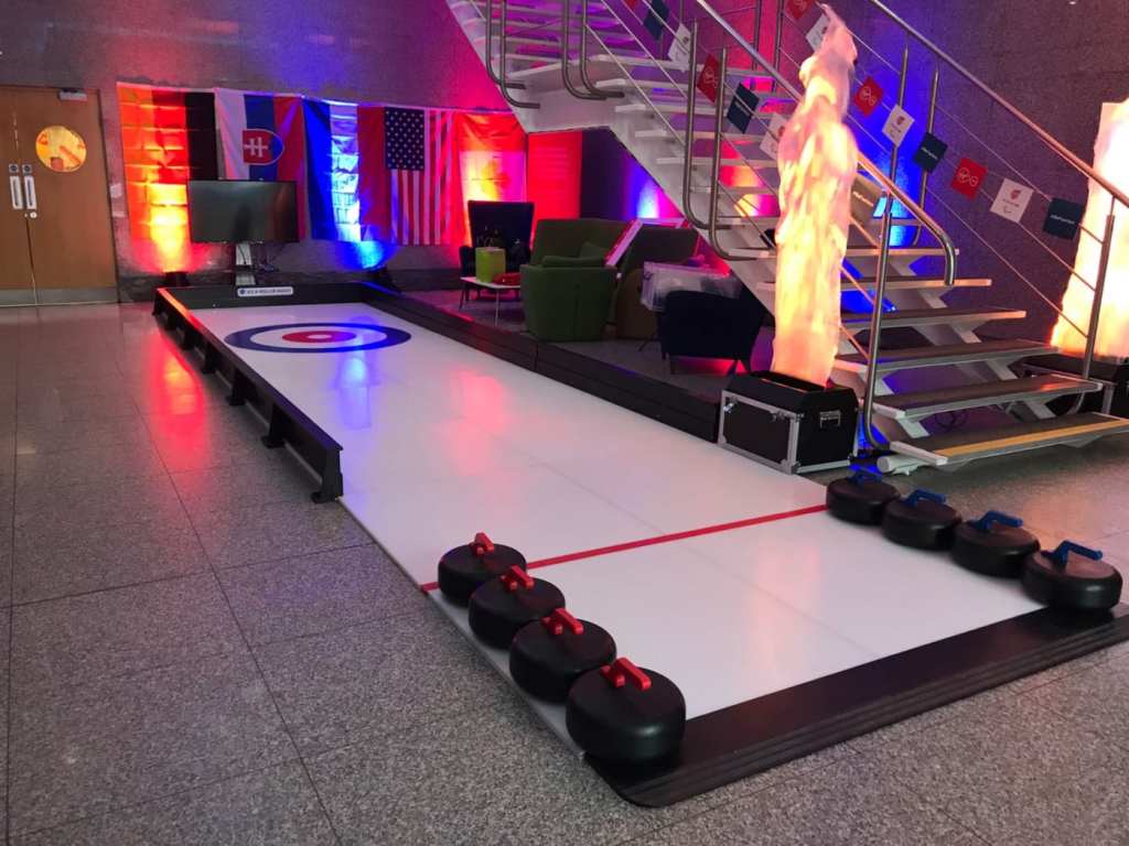 One or more Curling Lanes with a Festive Gazebo, 5 ft Singing Santa, Light up Reindeer, Inflatable Santas and any of our other Christmas Decorations – a perfect family event, private Christmas Party, Wedding or Corporate Function.